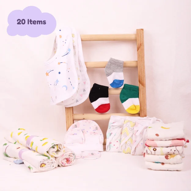 5 Multi-coloured printed muslin napkins, 3 Bibs, 3 Socks, 1 Cap, 1 Mitten, 1 Bottie, 3 Muslin Swaddle, 3 cushioned nappies,